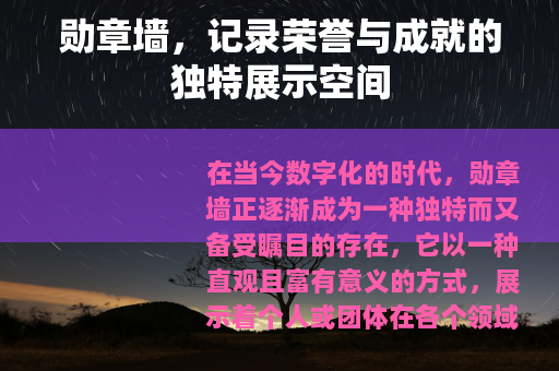 勋章墙以其独特的魅力和价值,在现代社会中占据着重要的地位,它是荣誉的象征,是激励的工具,是文化的传承者,也是历史的记录者,它将继续在各个领域中发挥作用,激励着人们不断创造更加辉煌的成就,为个人的成长、团队的发展以及社会的进步贡献自己的力量,让我们共同期待勋章墙在未来能够绽放出更加绚烂的光彩,为我们的生活增添更多的精彩与意义。