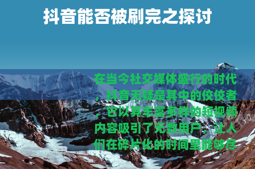 在当今社交媒体盛行的时代,抖音无疑是其中的佼佼者,它以其丰富多样的短视频内容吸引了无数用户,让人们在碎片化的时间里能够尽情享受各种娱乐和知识的获取,一个有趣的问题随之而来:抖音能刷完吗?