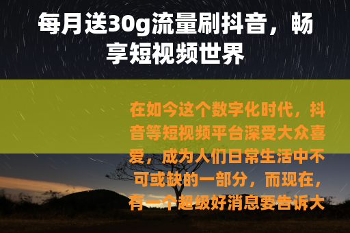 这每月送30g流量刷抖音的福利,为广大抖音爱好者带来了极大的便利和实惠,让大家能够更加畅快地在抖音的世界里遨游,尽情享受短视频带来的无限魅力。