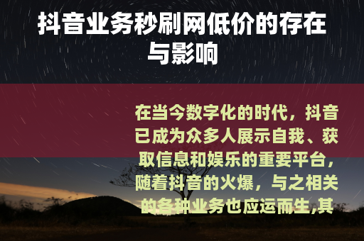 在当今数字化的时代,抖音已成为众多人展示自我、获取信息和娱乐的重要平台,随着抖音的火爆,与之相关的各种业务也应运而生,其中抖音业务秒刷网低价的现象引起了不少人的关注。