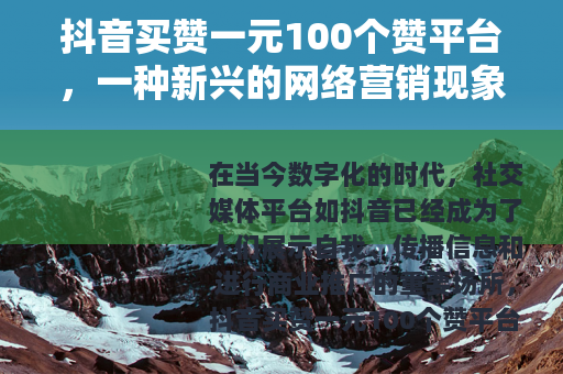在当今数字化的时代,社交媒体平台如抖音已经成为了人们展示自我、传播信息和进行商业推广的重要场所,抖音买赞一元100个赞平台的出现,引起了广泛的关注和讨论。