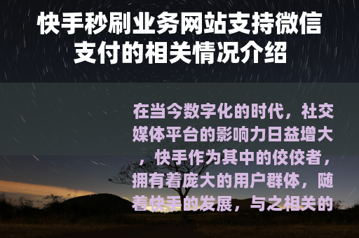 在当今数字化的时代,社交媒体平台的影响力日益增大,快手作为其中的佼佼者,拥有着庞大的用户群体,随着快手的发展,与之相关的一些业务也应运而生,其中就包括快手秒刷业务网站,这些网站提供了一种快速增加快手账号相关数据的途径,并且支持微信支付,为用户带来了一定的便利。