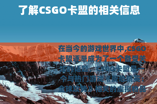 在当今的游戏世界中,CSGO卡盟逐渐成为了一个备受关注的话题,CSGO卡盟是一个与热门游戏《反恐精英:全球攻势》相关的虚拟物品交易平台,它为玩家们提供了一个便捷的途径,使得他们能够在其中交易各种游戏道具、皮肤等物品。