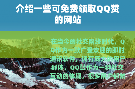 免费领取QQ赞的网站为QQ用户提供了一个便捷、实用的平台,让用户能够轻松获得更多的赞,提升自己在QQ社交平台上的人气和影响力,丰富自己的社交生活,实现更好的社交互动效果,只要用户合理利用这些网站,就能够在QQ社交世界中收获更多的快乐和价值。