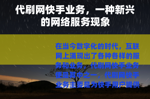 在当今数字化的时代,互联网上涌现出了各种各样的服务和业务,代刷网快手业务便是其中之一,代刷网快手业务主要是为快手用户提供一系列的助力服务,旨在帮助用户在快手上获得更多的关注、点赞、评论以及粉丝数量等。