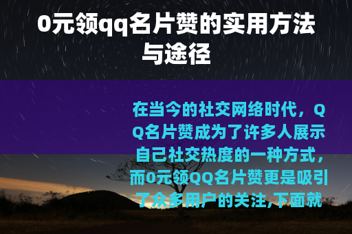 0元领QQ名片赞是完全可行的,只要我们善于利用各种资源和方法,积极参与QQ社交中的各种活动,就能够在不花费任何费用的情况下,让自己的QQ名片赞数量不断增加,提升自己在QQ社交平台上的人气和影响力,通过这些方式获得的名片赞,不仅是一种数字上的增长,更是我们在社交网络中积极互动、展示自我的成果体现,能够让我们在QQ的社交世界里更加自信和快乐地与他人交流和分享。