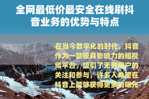 在当今数字化的时代,抖音作为一款极具影响力的短视频平台,吸引了无数用户的关注和参与,许多人希望在抖音上能够获得更多的曝光、点赞、评论和粉丝,以提升自己在平台上的影响力和知名度,而全网最低价最安全在线刷抖音业务便应运而生,为用户提供了一种实现这些目标的途径。