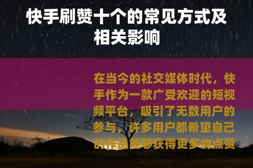 在当今的社交媒体时代,快手作为一款广受欢迎的短视频平台,吸引了无数用户的参与,许多用户都希望自己的作品能够获得更多的点赞,以提高曝光度和人气,快手刷赞十个的现象也时有发生。