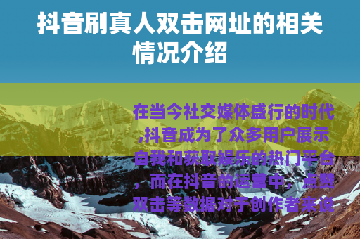 在当今社交媒体盛行的时代,抖音成为了众多用户展示自我和获取娱乐的热门平台,而在抖音的运营中,点赞双击等数据对于创作者来说有着重要的意义,它在一定程度上反映了作品的受欢迎程度,就出现了一些所谓的抖音刷真人双击网址。