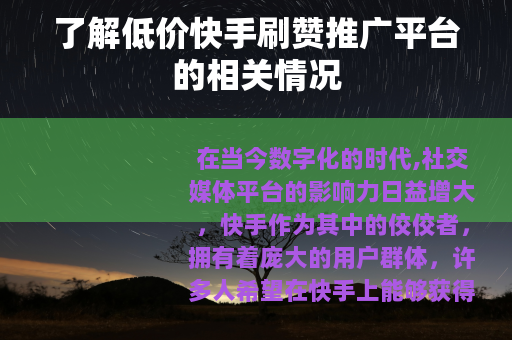 在当今数字化的时代,社交媒体平台的影响力日益增大,快手作为其中的佼佼者,拥有着庞大的用户群体,许多人希望在快手上能够获得更多的关注和点赞,从而提升自己的影响力和知名度,而刷赞推广平台便在这样的需求下应运而生,其中低价快手刷赞推广平台更是受到了不少人的关注。