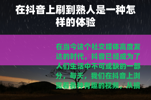 在抖音上刷到熟人是一种充满乐趣和惊喜的体验,它让我们在虚拟的网络世界中感受到了现实生活中的温暖和熟悉,也为我们的生活增添了更多的色彩和可能性,让我们珍惜这些在抖音上与熟人相遇的瞬间,共同在这个充满活力的平台上分享生活、传递快乐。