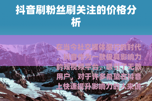 在当今社交媒体盛行的时代,抖音作为一款极具影响力的短视频平台,吸引了无数用户,对于许多希望在抖音上快速提升影响力的人来说,刷粉丝和刷关注成为了一个备受关注的话题,而其中大家最关心的就是抖音刷粉丝刷关注的价格。