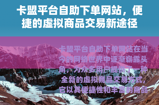 卡盟平台自助下单网站在当今的网络世界中逐渐崭露头角,为众多用户提供了一种全新的虚拟商品交易方式,它以其便捷性和丰富的商品种类吸引着越来越多的人关注和使用。