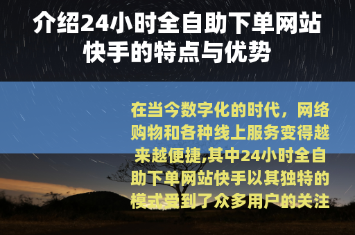 在当今数字化的时代,网络购物和各种线上服务变得越来越便捷,其中24小时全自助下单网站快手以其独特的模式受到了众多用户的关注。
