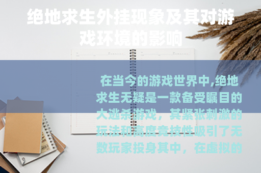 在当今的游戏世界中,绝地求生无疑是一款备受瞩目的大逃杀游戏,其紧张刺激的玩法和高度竞技性吸引了无数玩家投身其中,在虚拟的战场上展开激烈角逐,而在这个充满热血与激情的游戏场景背后,却存在着一个不容忽视的现象——绝地求生外挂。