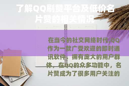 在当今的社交网络时代,QQ作为一款广受欢迎的即时通讯软件,拥有庞大的用户群体,在QQ的众多功能中,名片赞成为了很多用户关注的一个方面,而与之相关的QQ刷赞平台和低价名片赞也随之兴起,引起了不少人的兴趣。