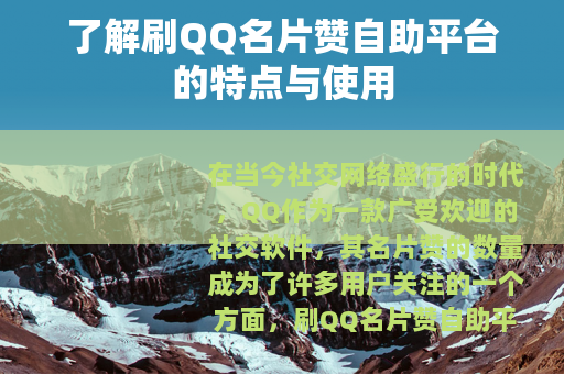 在当今社交网络盛行的时代,QQ作为一款广受欢迎的社交软件,其名片赞的数量成为了许多用户关注的一个方面,刷QQ名片赞自助平台也随之应运而生,为用户提供了一种增加名片赞数量的途径。