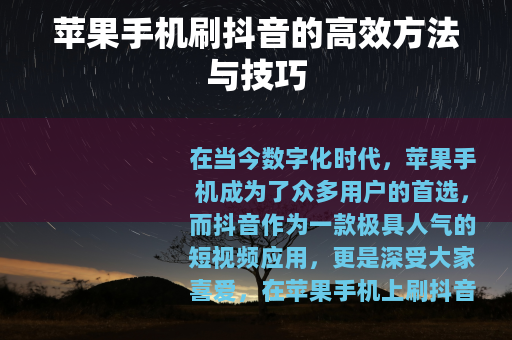 在当今数字化时代,苹果手机成为了众多用户的首选,而抖音作为一款极具人气的短视频应用,更是深受大家喜爱,在苹果手机上刷抖音,有着独特的体验和多种方式可以让我们更好地享受其中的乐趣。
