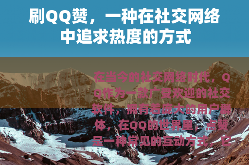 在当今的社交网络时代,QQ作为一款广受欢迎的社交软件,拥有着庞大的用户群体,在QQ的世界里,点赞是一种常见的互动方式,它代表着朋友们对你的关注、认可和喜爱,而刷QQ赞,也随之成为了一种独特的现象,在一定程度上满足了人们对于社交热度的追求。