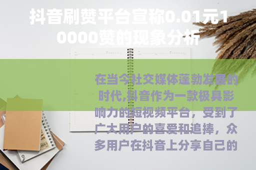 在当今社交媒体蓬勃发展的时代,抖音作为一款极具影响力的短视频平台,受到了广大用户的喜爱和追捧,众多用户在抖音上分享自己的生活点滴、才艺表演等,希望能获得更多的点赞和关注,从而扩大自己的影响力,而与此同时,一种声称抖音刷赞平台0.01元10000赞的现象也悄然出现。