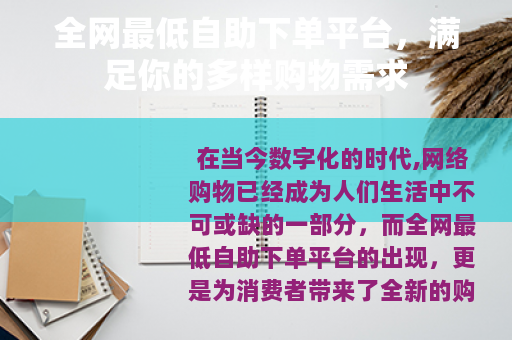 在当今数字化的时代,网络购物已经成为人们生活中不可或缺的一部分,而全网最低自助下单平台的出现,更是为消费者带来了全新的购物体验和诸多便利。