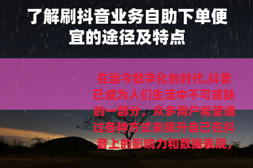 在当今数字化的时代,抖音已成为人们生活中不可或缺的一部分,众多用户希望通过各种方式来提升自己在抖音上的影响力和数据表现,刷抖音业务自助下单便宜的服务受到了不少人的关注。