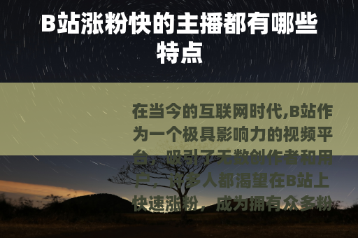 在当今的互联网时代,B站作为一个极具影响力的视频平台,吸引了无数创作者和用户,许多人都渴望在B站上快速涨粉,成为拥有众多粉丝的知名主播,B站涨粉快的主播究竟有哪些特点呢? 的独特性是关键,那些涨粉迅速的主播往往能够提供与众不同的视频内容,他们可能专注于某个特定的小众领域,如小众乐器演奏、古老手工艺传承等,满足了特定群体的兴趣需求,或者以独特的视角和创意来呈现常见的主题,让观众在众多类似的视频中眼前一亮,有的主播会将美食制作与搞笑剧情相结合,在教大家做菜的同时,又能带来欢乐的氛围,使观众在轻松愉快的状态下记住了主播和其内容。