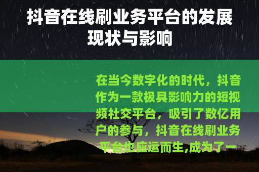 在当今数字化的时代,抖音作为一款极具影响力的短视频社交平台,吸引了数亿用户的参与,抖音在线刷业务平台也应运而生,成为了一个备受关注的现象。