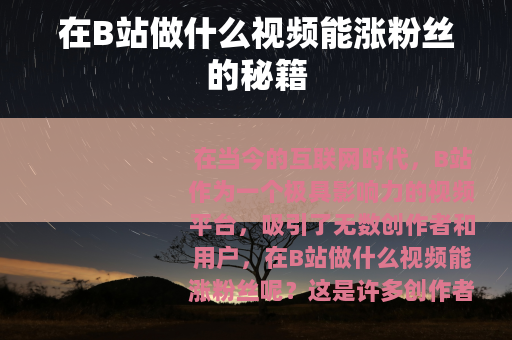 在当今的互联网时代,B站作为一个极具影响力的视频平台,吸引了无数创作者和用户,在B站做什么视频能涨粉丝呢?这是许多创作者都关心的问题。