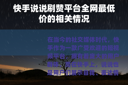 在当今的社交媒体时代,快手作为一款广受欢迎的短视频平台,拥有着庞大的用户群体,而在快手上,说说也是用户们展示自我、表达情感和分享生活的重要方式之一,快手说说刷赞平台全网最低价啊这样的信息开始在一些网络角落出现,引起了不少人的关注。