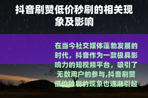 在当今社交媒体蓬勃发展的时代,抖音作为一款极具影响力的短视频平台,吸引了无数用户的参与,抖音刷赞低价秒刷的现象也逐渐引起了人们的关注。