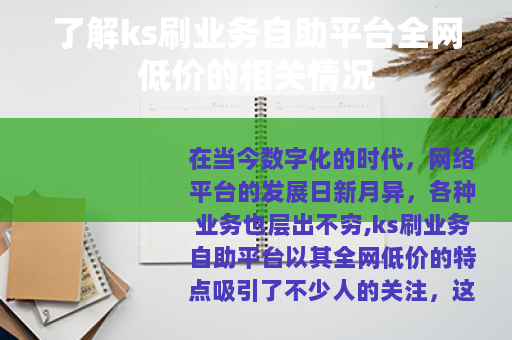 在当今数字化的时代,网络平台的发展日新月异,各种业务也层出不穷,ks刷业务自助平台以其全网低价的特点吸引了不少人的关注。
