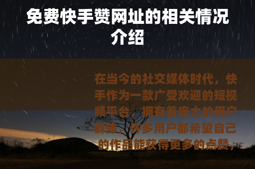 在当今的社交媒体时代,快手作为一款广受欢迎的短视频平台,拥有着庞大的用户群体,许多用户都希望自己的作品能获得更多的点赞,以此来增加作品的热度和曝光度,在这种需求下,免费快手赞网址便应运而生。