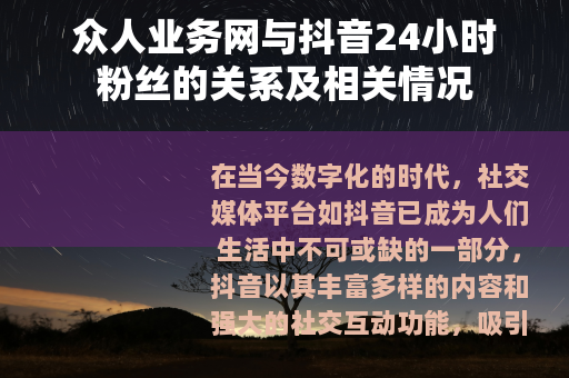 在当今数字化的时代,社交媒体平台如抖音已成为人们生活中不可或缺的一部分,抖音以其丰富多样的内容和强大的社交互动功能,吸引了数以亿计的用户,而在这个庞大的生态系统中,出现了一些与粉丝增长相关的现象,其中众人业务网与抖音24小时粉丝的话题备受关注。