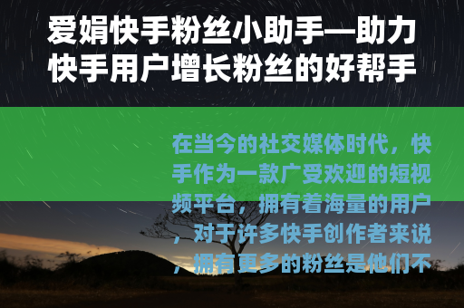 在当今的社交媒体时代,快手作为一款广受欢迎的短视频平台,拥有着海量的用户,对于许多快手创作者来说,拥有更多的粉丝是他们不断追求的目标之一,而爱娟快手粉丝小助手的出现,为他们提供了一个有效的途径来实现粉丝增长的愿望。
