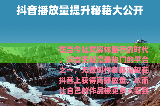 在当今社交媒体盛行的时代,抖音无疑是最热门的平台之一,无数创作者都渴望在抖音上获得高播放量,从而让自己的作品被更多人看到,实现自己的创作价值,究竟有哪些方法可以在抖音上提高播放量呢?下面就为大家详细介绍。 的质量是至关重要的,一个优质的视频内容能够迅速吸引用户的注意力并引发他们的兴趣,这就要求创作者在选题上要下功夫,选择那些当下热门且具有话题性的主题,这样才能更容易与广大用户产生共鸣,在视频的制作过程中,要确保画面清晰、稳定,声音清楚,剪辑流畅,一个制作精良的视频会给用户带来更好的观看体验,从而增加他们看完整个视频的可能性,这对于提高播放量是非常关键的。