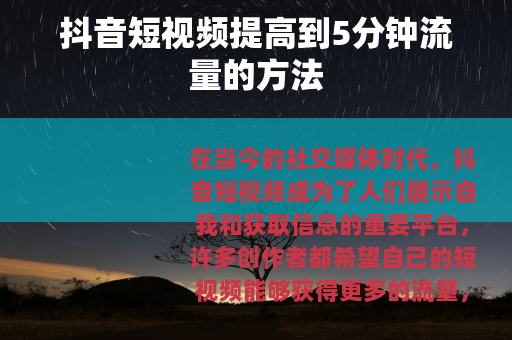 在当今的社交媒体时代,抖音短视频成为了人们展示自我和获取信息的重要平台,许多创作者都希望自己的短视频能够获得更多的流量,尤其是当视频时长达到5分钟时,如何提高流量成为了一个关键问题。 的质量是至关重要的,要确保视频内容有吸引力、有价值且具有独特性,可以从用户的兴趣点出发,选择热门话题进行创作,如美食制作、旅行攻略、时尚穿搭等,通过精心策划和拍摄,为观众呈现出高质量的视觉和听觉体验。