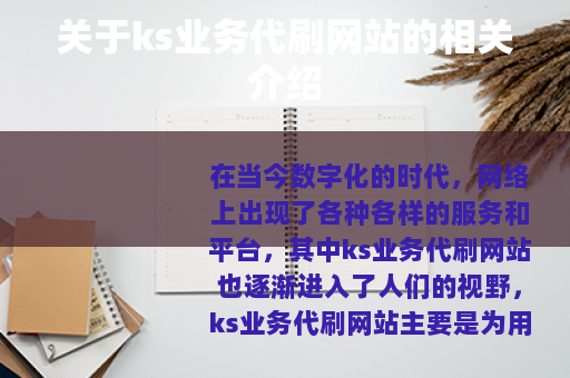 在当今数字化的时代,网络上出现了各种各样的服务和平台,其中ks业务代刷网站也逐渐进入了人们的视野,ks业务代刷网站主要是为用户提供在快手平台上的一些数据代刷服务,比如粉丝数量、点赞量、评论量等。