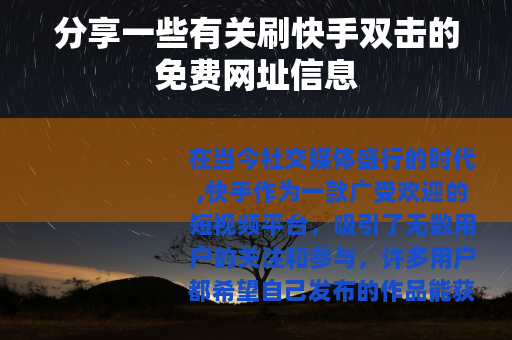 当我们在网络上搜索刷快手双击的免费网址时,会发现有很多不同的选择,这些网址通常声称可以帮助用户快速增加快手作品的双击数量,而且操作简单方便,不需要花费任何费用,其中一些网址提供了详细的使用说明和教程,让用户可以轻松上手。