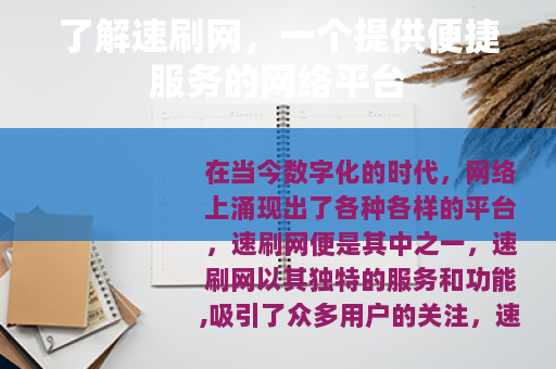 在当今数字化的时代,网络上涌现出了各种各样的平台,速刷网便是其中之一,速刷网以其独特的服务和功能,吸引了众多用户的关注。