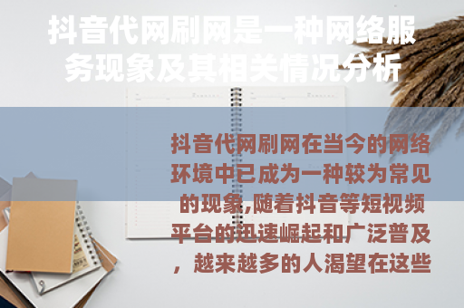 抖音代网刷网在当今的网络环境中已成为一种较为常见的现象,随着抖音等短视频平台的迅速崛起和广泛普及,越来越多的人渴望在这些平台上获得更多的关注、点赞、评论和粉丝,以提升自己的影响力和知名度,在这种需求的推动下,抖音代网刷网服务应运而生。