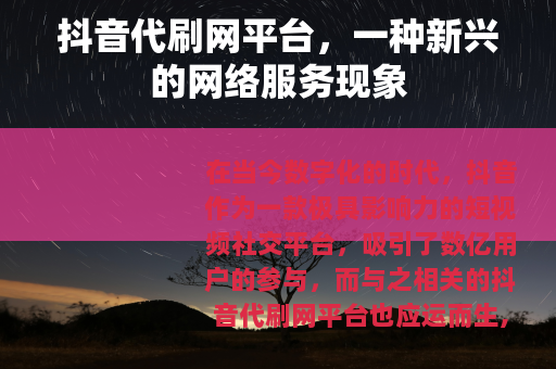 在当今数字化的时代,抖音作为一款极具影响力的短视频社交平台,吸引了数亿用户的参与,而与之相关的抖音代刷网平台也应运而生,成为了网络世界中一个备受关注的话题。