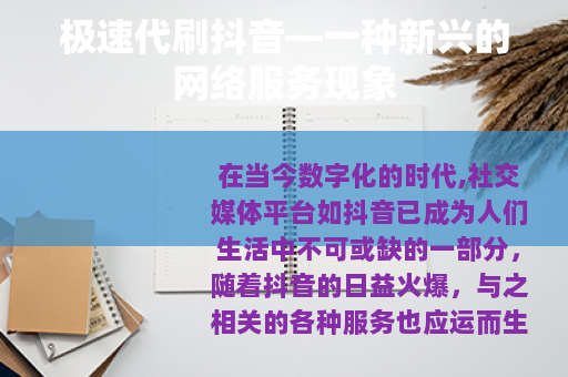 在当今数字化的时代,社交媒体平台如抖音已成为人们生活中不可或缺的一部分,随着抖音的日益火爆,与之相关的各种服务也应运而生,其中极速代刷抖音服务引起了不少人的关注。