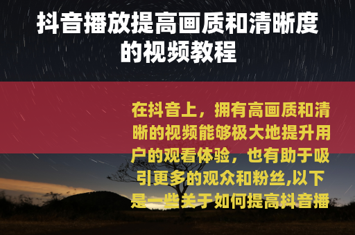 在抖音上,拥有高画质和清晰的视频能够极大地提升用户的观看体验,也有助于吸引更多的观众和粉丝,以下是一些关于如何提高抖音播放画质和清晰度的视频教程方法。