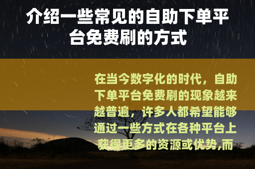 在当今数字化的时代,自助下单平台免费刷的现象越来越普遍,许多人都希望能够通过一些方式在各种平台上获得更多的资源或优势,而自助下单平台免费刷似乎提供了这样一种可能。