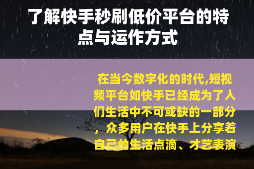 在当今数字化的时代,短视频平台如快手已经成为了人们生活中不可或缺的一部分,众多用户在快手上分享着自己的生活点滴、才艺表演等,同时也希望能够获得更多的关注和点赞,以提升自己在平台上的影响力,而在这样的需求下,快手秒刷低价平台应运而生。
