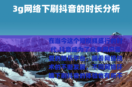 在当今这个短视频盛行的时代,抖音成为了众多用户喜爱的娱乐平台,随着网络技术的不断发展,不同网络环境下刷抖音的体验也有所不同,今天我们就来探讨一下在3g网络下可以刷抖音多长时间的问题。