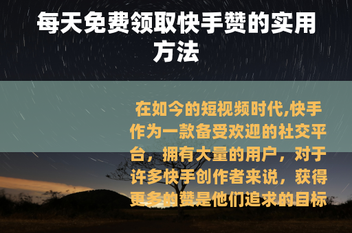 在如今的短视频时代,快手作为一款备受欢迎的社交平台,拥有大量的用户,对于许多快手创作者来说,获得更多的赞是他们追求的目标之一,因为赞不仅代表着作品的受欢迎程度,还能在一定程度上增加账号的曝光度,而今天,我们就来聊聊如何每天免费领取快手赞。