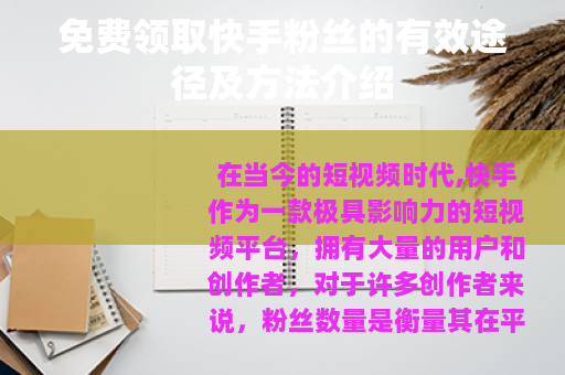 在当今的短视频时代,快手作为一款极具影响力的短视频平台,拥有大量的用户和创作者,对于许多创作者来说,粉丝数量是衡量其在平台上影响力和成功与否的重要指标之一,很多人都在寻找能够免费领取快手粉丝的方法,以下就为大家介绍一些可行的途径和策略。