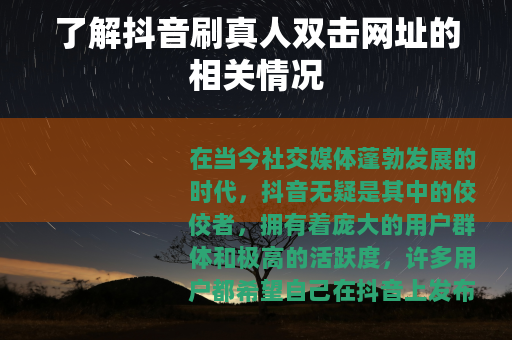 在当今社交媒体蓬勃发展的时代,抖音无疑是其中的佼佼者,拥有着庞大的用户群体和极高的活跃度,许多用户都希望自己在抖音上发布的作品能够获得更多的关注和双击点赞,从而提升自己的影响力和知名度,而抖音刷真人双击网址也在这样的需求下应运而生。
